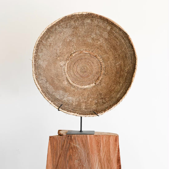 An artifact of Zambian craftsmanship, this handwoven basket embodies six decades of history and artistry. Made from natural grasses and reeds, it showcases a tight, intricate weave that speaks to the skill and patience of its maker. Once used for winnowing grain, the basket now rests on a custom iron stand, transforming it into a sculptural object that celebrates form, texture, and heritage.