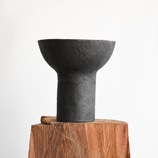 Made from recycled paper pulp, this piece is molded and shaped by hand, resulting in subtle irregularities that give it a soulful, organic character. The matte black finish and tactile surface make it a grounding accent piece for any interior.