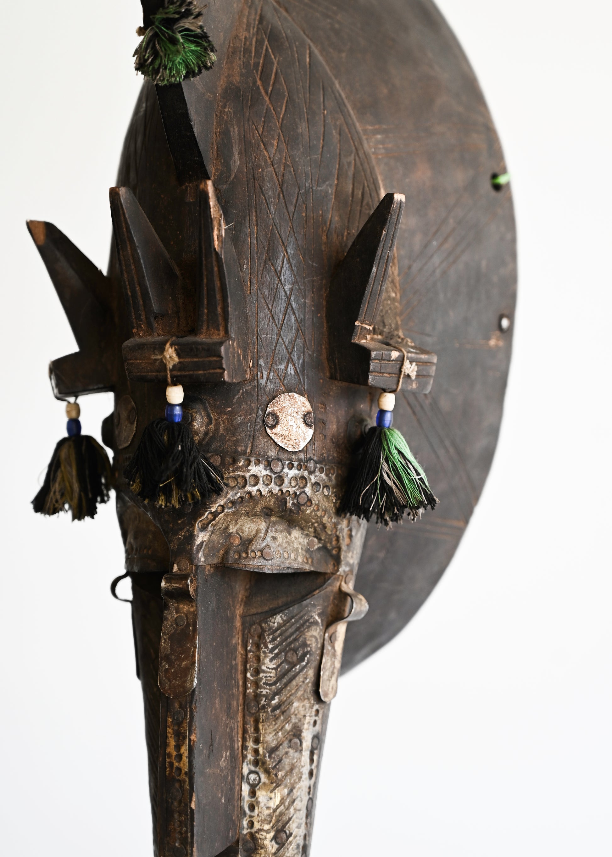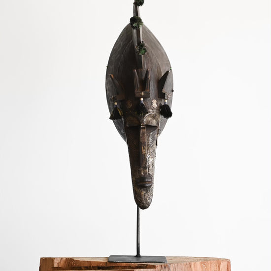 This antique art piece comes from the Bambara tribe in Mali, known for their rich cultural traditions and artistic expression. Made from wood and featuring intricate metalwork, it embodies the unique aesthetic of the Bambara people.